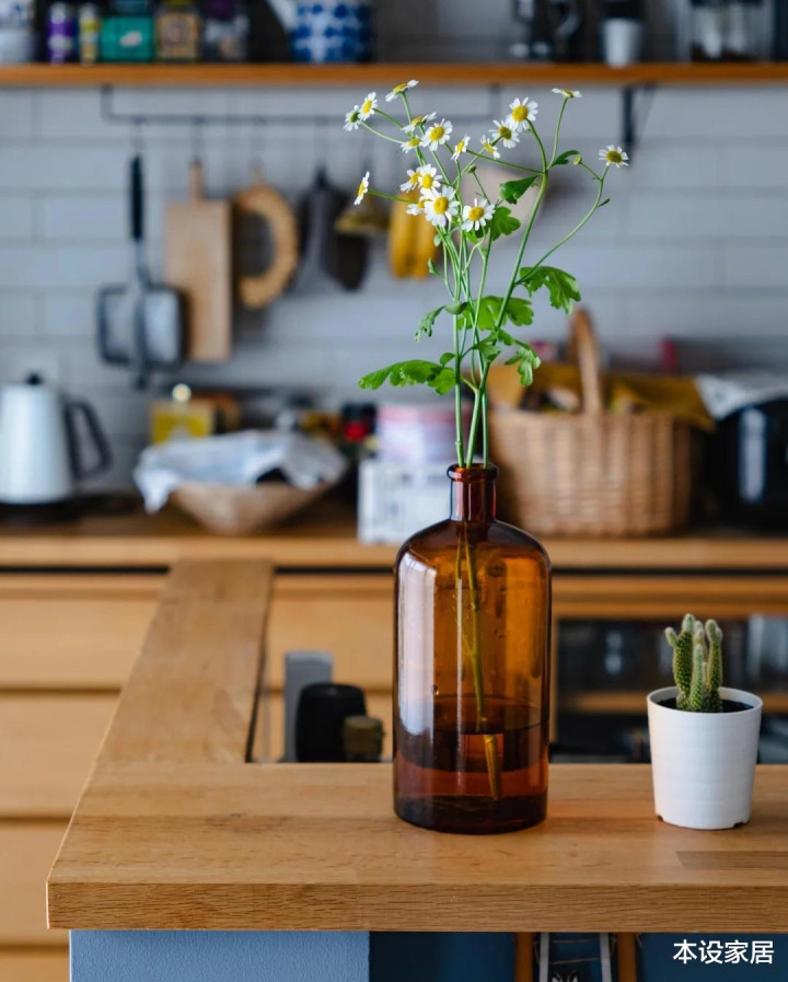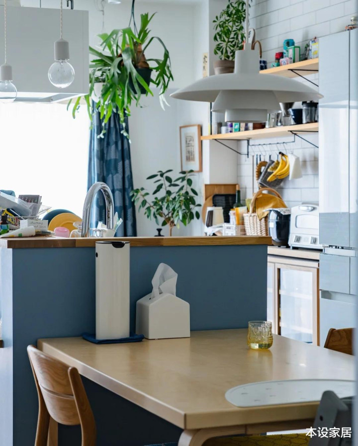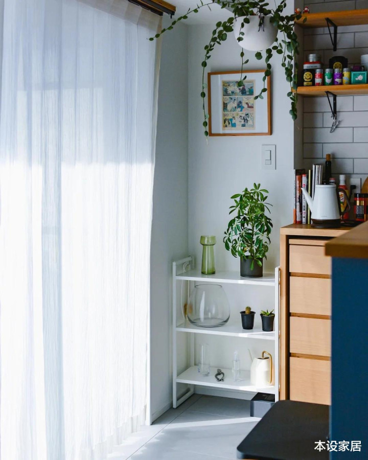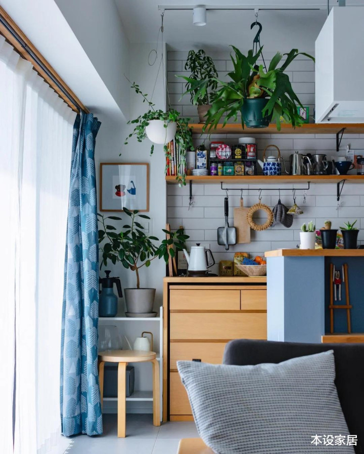 她将杂物有序地收到抽屉或者柜子,原木色+淡蓝色+绿植,干净又清爽,真佩服她独居住也能保持干净舒服。