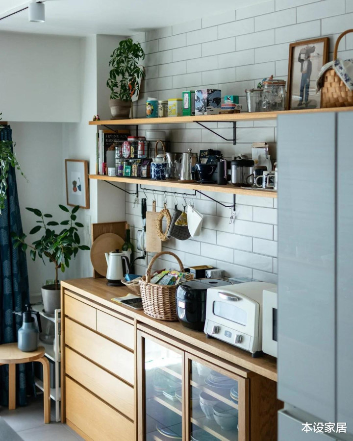 开放式厨房能给主人带来最多温暖的地方,也是日式家居的标配,可以提高空间利用率,日常饮食也以清淡为主,配置吸力大点的油烟机,无惧油烟困扰。