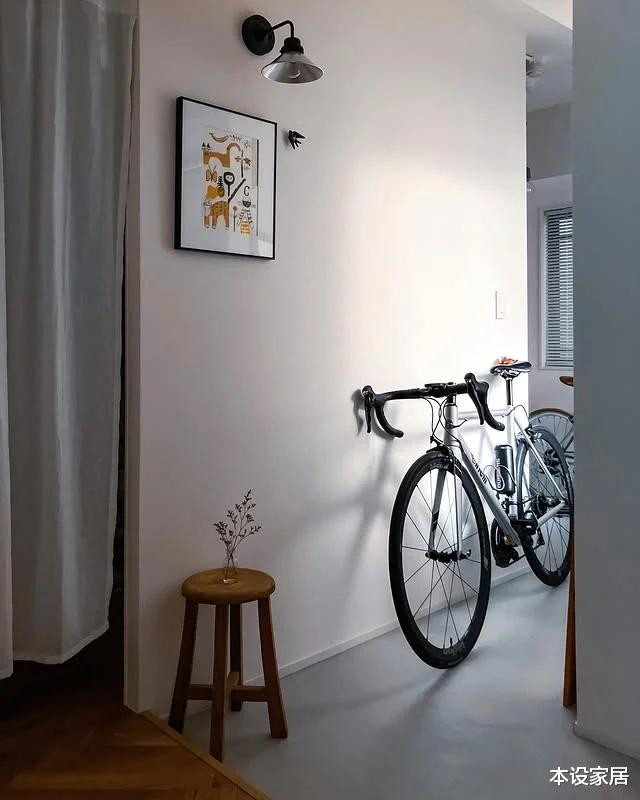 除了停放自行车外,还摆一张实木座椅,用来放置钥匙,平常放一抹绿植做点缀,搭配墙上装饰画,这个空间就十分完美了。